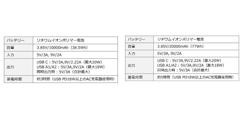 本製品は、大容量10000mAh(3.85V換算):700-BTL050BKと20000mAh(3.85V換算):700-BTL051BKのリチウムイオンポリマー電池を採用したモバイルバッテリー電源です。