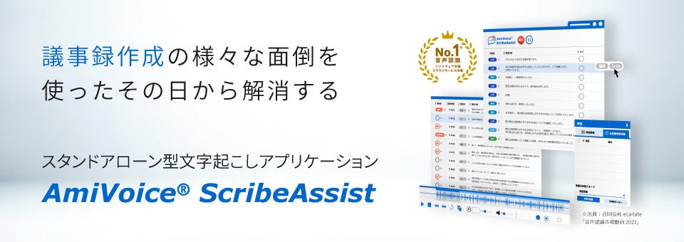 「AmiVoice ScribeAssist」は、国内市場シェアNo.1(※)のAI音声認識AmiVoiceを搭載し、オンライン/オフラインといった会議形態、WEB会議システムの種類を問わず使用できる、スタンドアローン型の文字起こし支援アプリケーションです。