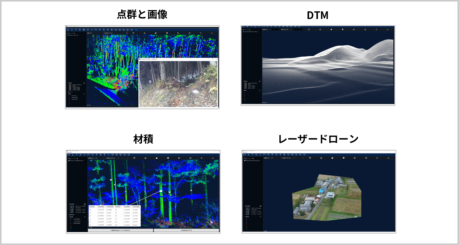 これまでの3次元点群の処理・解析ができるツールは、仕様や機能が複雑で分かりづらく、かなり高価で導入が難しい上に、森林・林業の現場に必要とされる機能だけに特化して3次元点群の処理・解析を行えるものはなく、森林・林業関係の業務に携わる方々が日常的に使いこなすことがかなり困難な状況でした。