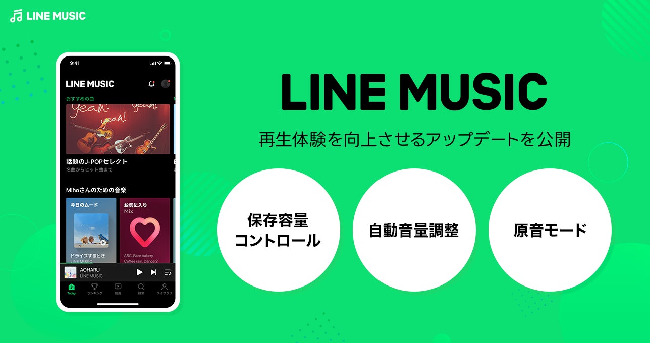 「LINE MUSIC」は、邦楽・洋楽問わず1億曲以上の幅広いジャンルの楽曲を利用シーンや気分に応じていつでもどこでも聴くことができる音楽ストリーミングサービスです。今回のアップデートでは、オフライン環境において再生をよりスムーズにすることができるフローの改善、およびオフライン保存容量を管理することができる保存管理オプションを追加しました。さらに、再生体験向上のため、楽曲検索の改善や、各楽曲の音の大きさを一定にする「自動音量調整」(ラウドネスノーマライゼーション)※、細かい音をはじめ原音を最大限楽しめる「原音モード」※をオプションから選択できるようになりました。
