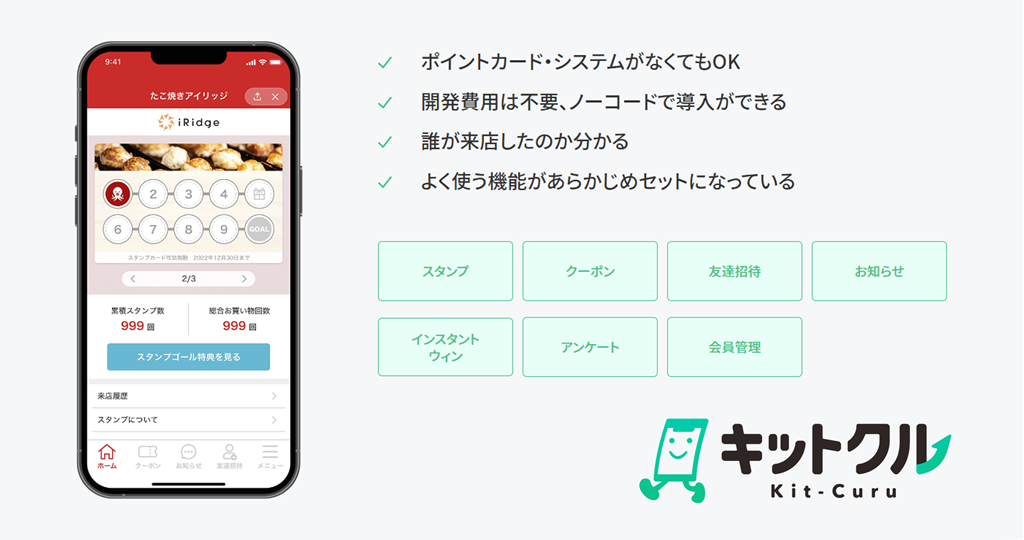 「Kit-Curu」は、別途ポイントシステムを導入することなく単体でCRM(顧客関係管理)や来店分析、集客施策を行えるLINEミニアプリの販促ツールで、月額5万円から利用可能です。店舗集客のきっかけとなるクーポンやスタンプカード、インスタントウィン(その場で当落がわかるタイプ)の抽選機能に加え、会員登録機能やアンケート、友達紹介機能などを搭載しています。クーポンやスタンプの利用状況、登録した属性情報、アンケートなどのデータをもとにセグメントを作成し、特定顧客限定クーポンや期間限定クーポン、枚数限定先着クーポンなどの発行も可能です。
