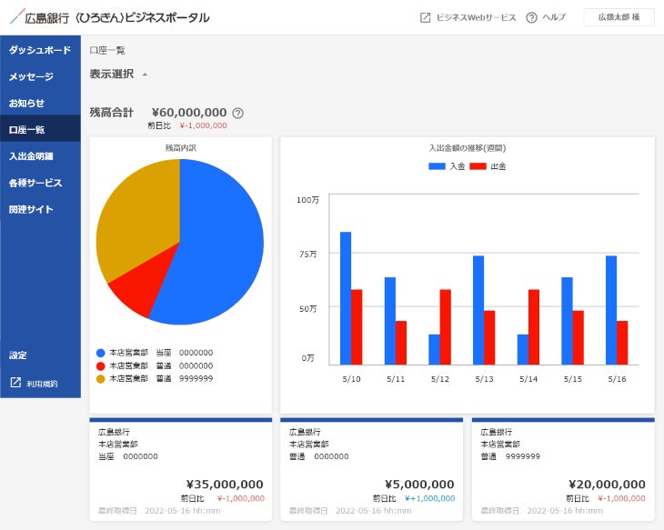 法人・個人事業主のお客さまが、入出金や残高情報などの取引明細照会だけでなく、広島銀行が提供する金融商品の情報や、各種サービスに簡単にアクセスすることができる無料のサービスです。