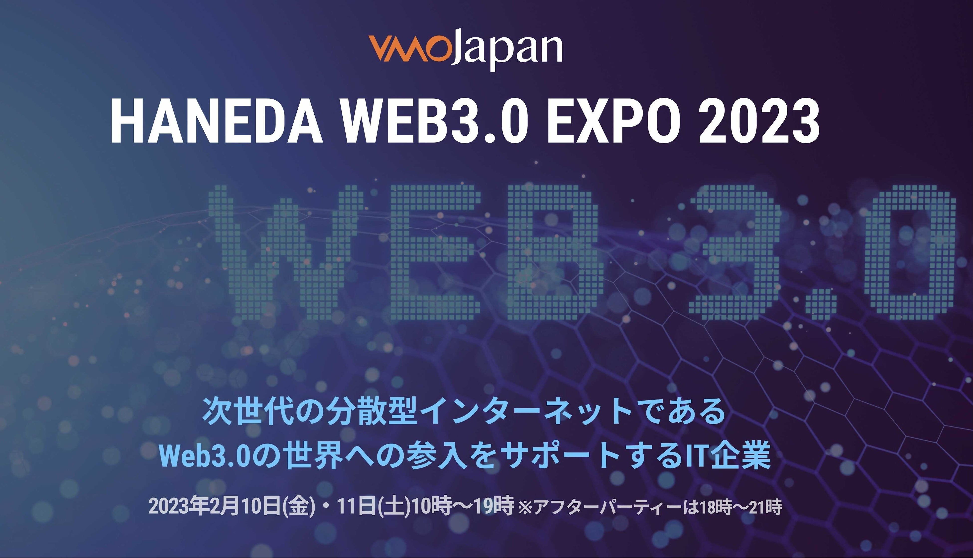 HANEDA WEB3.0 EXPO 2023は、羽田未来総合研究所により主催され、羽田空港を起点に日本でのweb3.0 におけるコミュニケーションがグローバル展開され新たなビジネスが創出されることを目指し「web3.0・ブロックチェーン」をテーマに国内のみならずグローバル企業が集結する展示会です。
