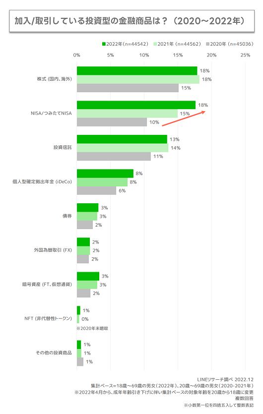 *投資型の金融商品・・・株式 (国内、海外)、投資信託、債券、NISA/つみたてNISA、個人型確定拠出年金 (iDeCo)、国為替取引 (FX)、暗号資産 (FT、仮想通貨)、NFT (非代替性トークン)、その他の投資商品