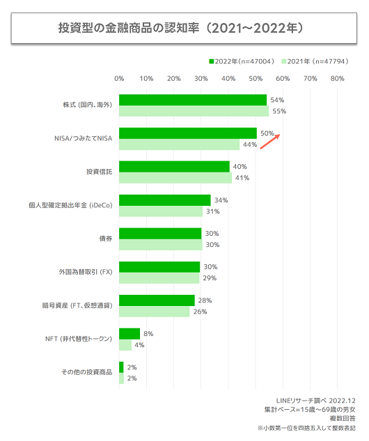 投資型の金融商品の認知について、以下のグラフで詳細をみてみると、株式(国内、海外)がもっとも高く54%となりました。次点の「NISA/つみたてNISA」が50%と、昨年から6ポイント上昇しました。その他にも「投資信託」が4割で、「個人型確定拠出年金(iDeCo)」が3割超で続きました。
