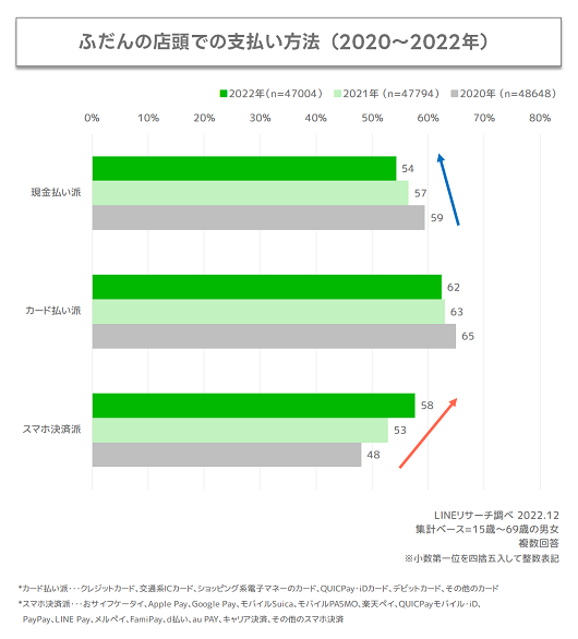 *スマホ決済派・・・おサイフケータイ、Apple Pay、Google Pay、モバイルSuica、モバイルPASMO、楽天ペイ、QUICPayモバイル・iD、PayPay、LINE Pay、メルペイ、FamiPay、d払い、au PAY、キャリア決済、その他のスマホ決済