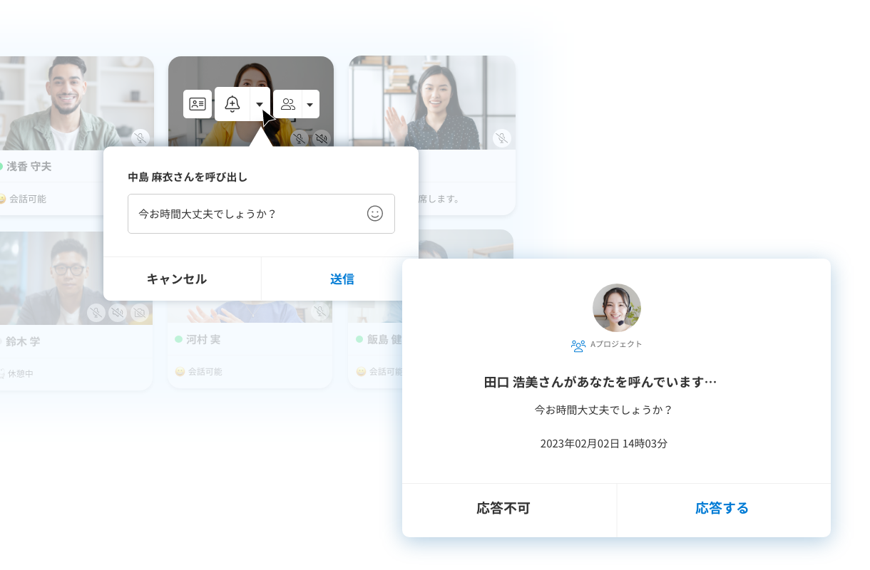 従来のワンクリックでの呼び出し機能の利便性は残しつつ、必要な場合のみ「今お時間はありますか?」などの任意のテキストメッセージを添えた呼び出しが可能となります。
