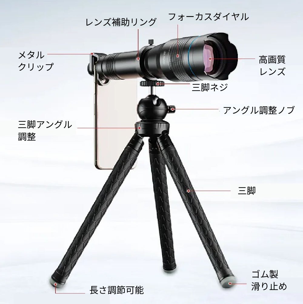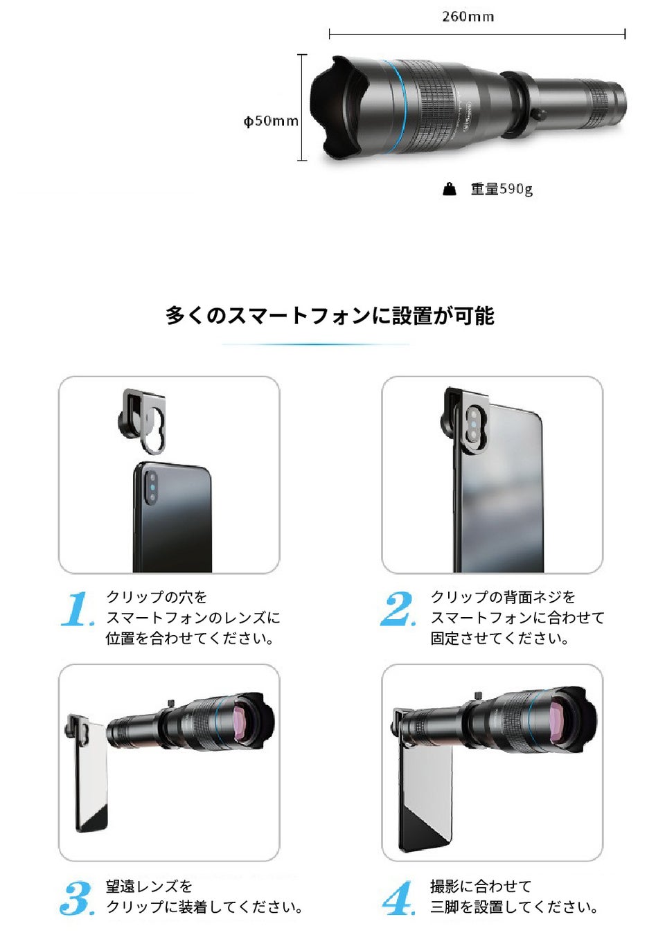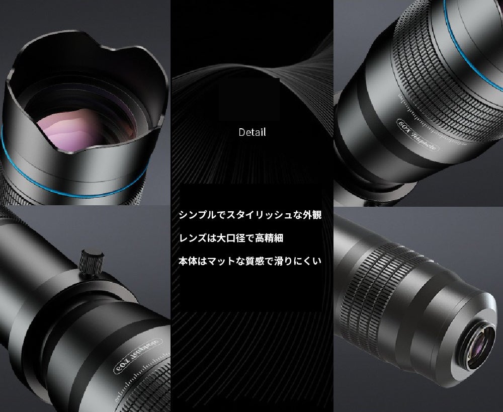 - スマートフォン専用の口径50mm最大60倍の望遠レンズ