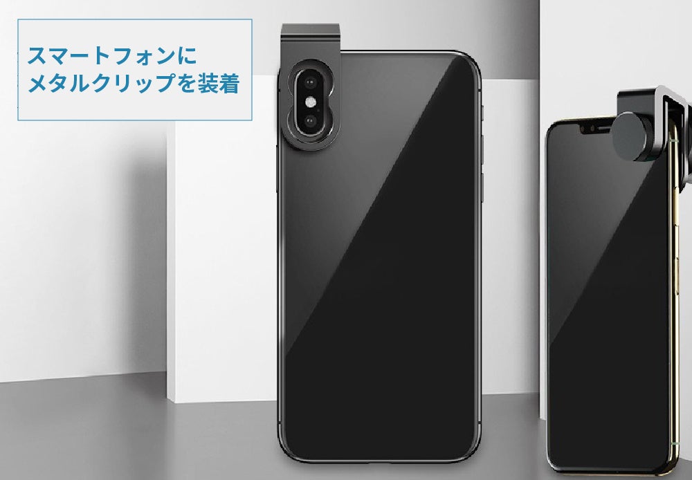 専用のクリップを使ってスマートフォンのカメラレンズに合わせて設置してください。