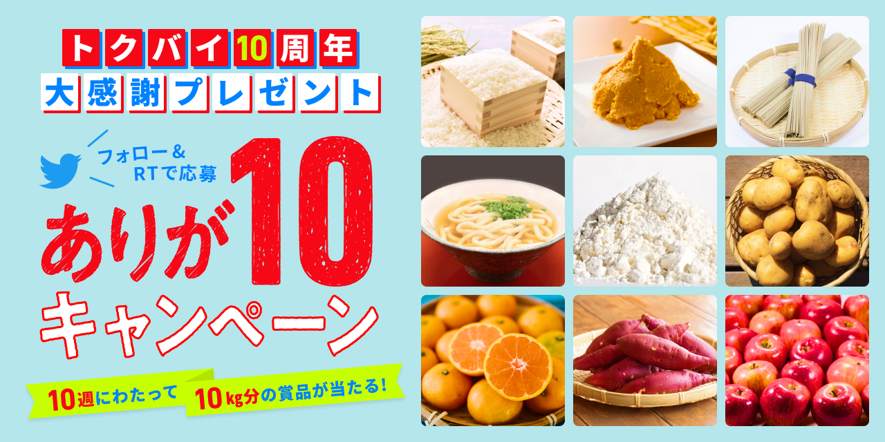 1)トクバイ10周年記念 10kgの食材が当たるフォロー&リツイートキャンペーン