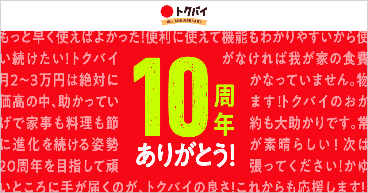 「トクバイ」がサービス提供開始から10周年を迎えることができたのは、生活者の皆さまが「トクバイ」を選び、ご利用くださっているおかげに他なりません。実際に、生活者の皆さまからは「便利に使えて、機能もわかりやすい」「トクバイがなければ、家の食費月2〜3万円は絶対にかなっていませんでした」「物価高の中、助かっています」などのお声をいただいています。この機会に改めて、ご利用くださっている全ての皆さまに感謝申し上げます。