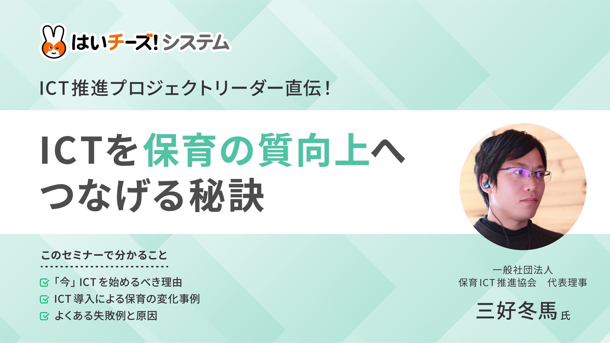 今回のオンラインセミナーでは、保育ICT推進協会 代表理事 三好冬馬氏を講師にお招きして、ICT導入による保育の変化事例を踏まえ、ICTを保育の質向上へつなげる秘訣についてお話しいただきます。