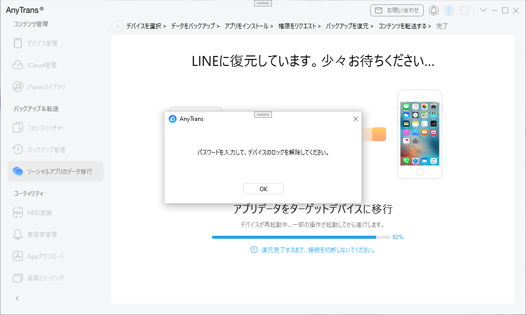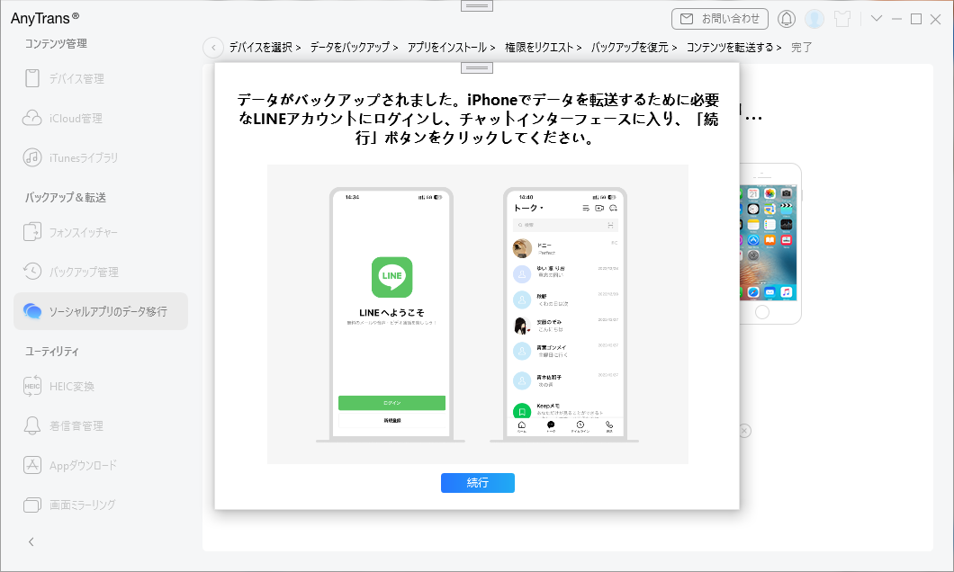 Step5:データがバックアップされた後、「続行」ボタンをクリックし、iPhoneのパスワードを入力してください。