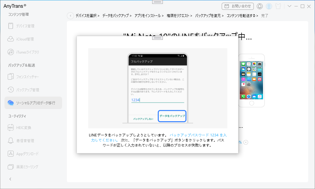 Step3:画面の指示に従ってAndroid携帯のLINEデータをバックアップします。