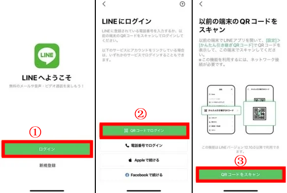 Step2:iPhoneでLINEを開いて、「ログイン」>「QRコードでログイン」>「QRコードをスキャン」の順に選択し、Step1が表示されるQRコードをスキャンします。(セキュリティ上、30秒経過すると、QRコードが表示されなくなってしまいますので、更新ボタンをお押してください。)