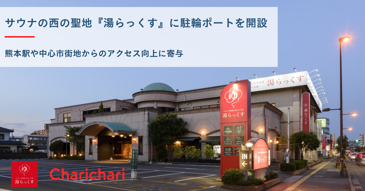 熊本市内でのチャリチャリのポートが増え、ご利用者さまも増加していく中でまちの皆さまから湯らっくすへのポート設置のご要望が多く寄せられたこと、ならびに市街地や熊本駅からの店舗へのアクセスの改善や周辺エリアの交通課題の解決に繋がるとして協議を進めてきたところ、今般の設置に至りました。