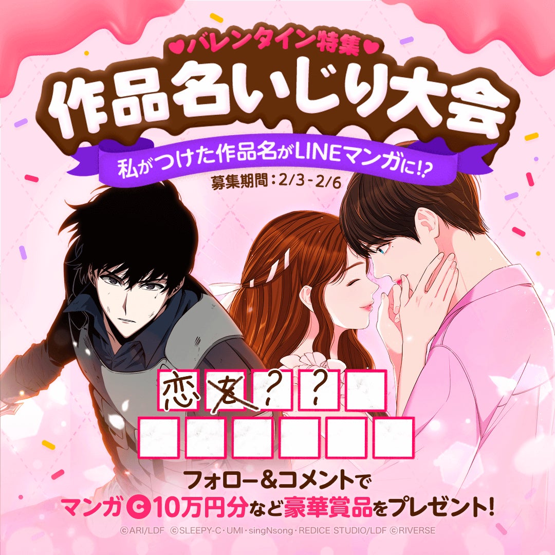 さらに、本日2月3日(金)から2月6日(月)まで、LINEマンガ公式TwitterおよびInstagramにて「作品名いじり大会」と称した参加型キャンペーンを開催しています。LINEマンガの人気オリジナル作品『全知的な読者の視点から』『星を飲み込んだ君へ』のいずれかを選び、該当の投稿に「あなたの考える甘い作品名」をリプライ、コメントすると応募完了です。最優秀賞にはマンガコイン10万円分をお贈りします。