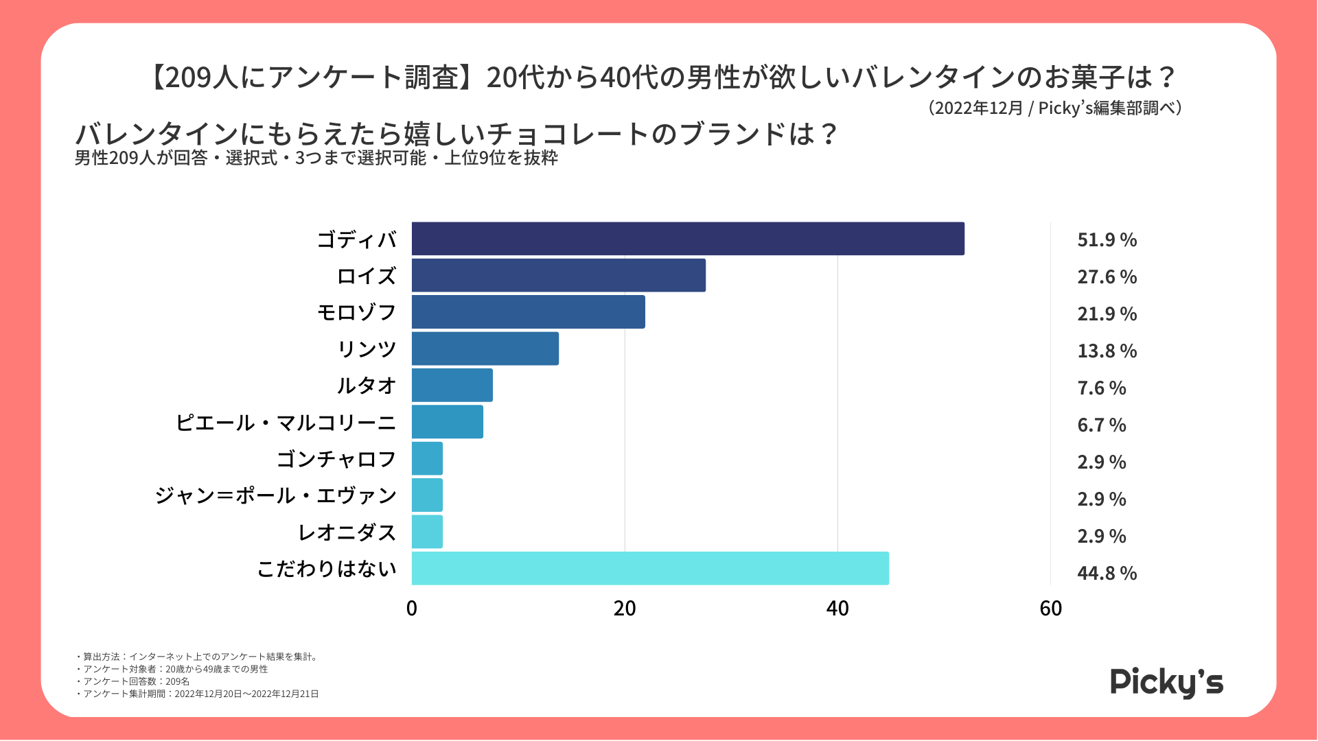 バレンタインに貰えたら嬉しいブランドを聞いたところ、1位には圧倒的な知名度を誇るゴディバ、続いてロイズ、モロゾフ、リンツと並ぶ結果となりました。参考結果となりますが、こだわりがないという回答は44.8%の得票率で、ゴディバの次にランクインする得票率となっています。