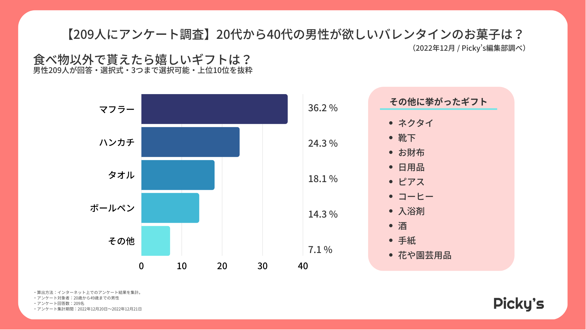 食べ物以外でのギフトではマフラー、ハンカチ、タオル、ボールペンと日常遣いできるギフトが多く回答されました。ランク外でもネクタイや靴下、財布など毎日のように使うものをもらえると嬉しいようです。