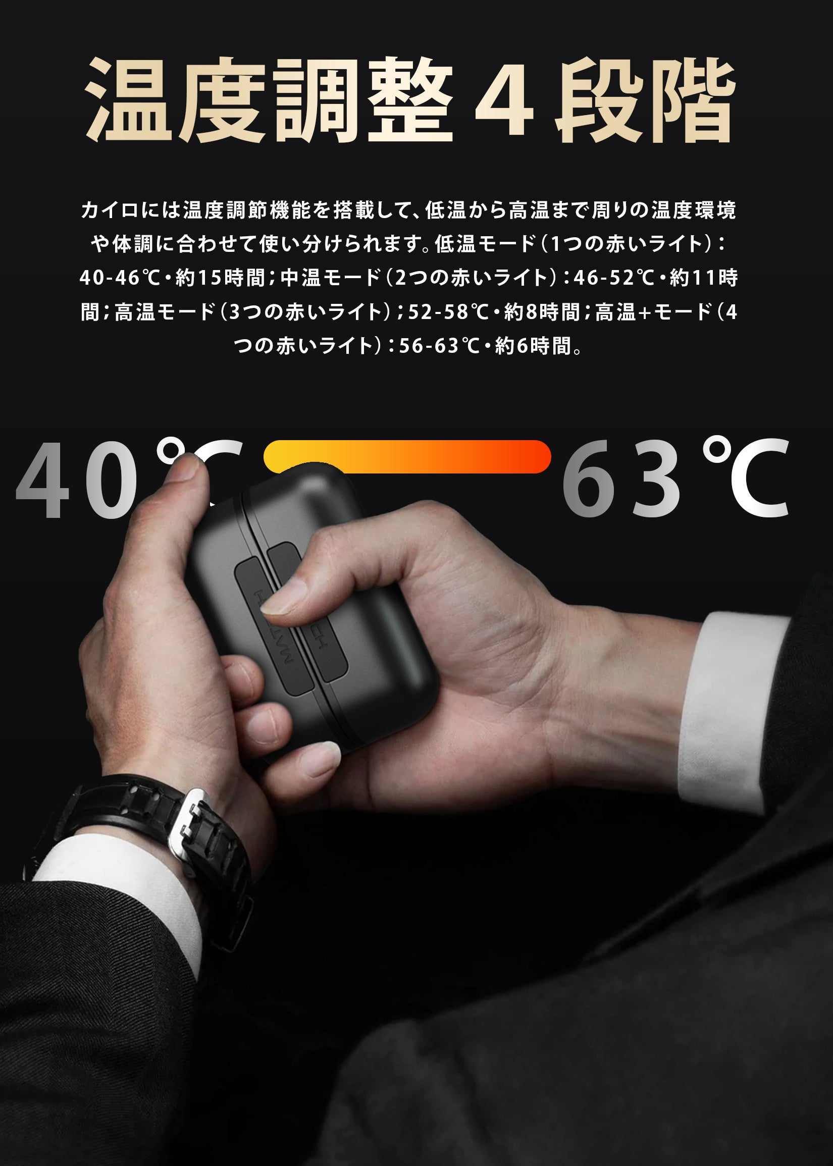アルミニウム素材を採用したことにより、熱伝導効率が良く、電気カイロの加熱を起動してすぐに暖まります。40℃~63℃まで、4段階の温度設定ができますので、ボタン操作で選択すると、選択した温度まですぐに温度が上昇します。