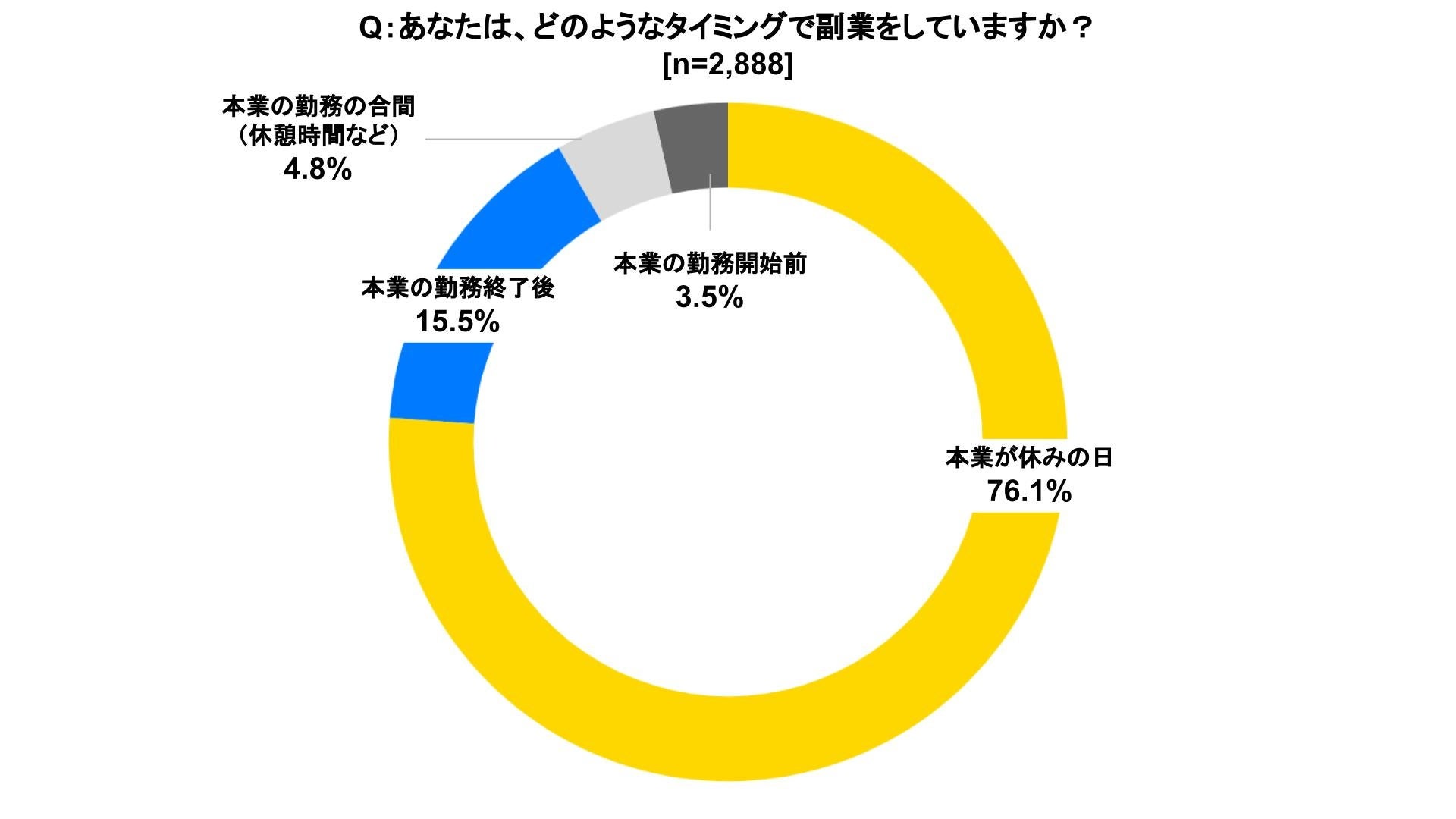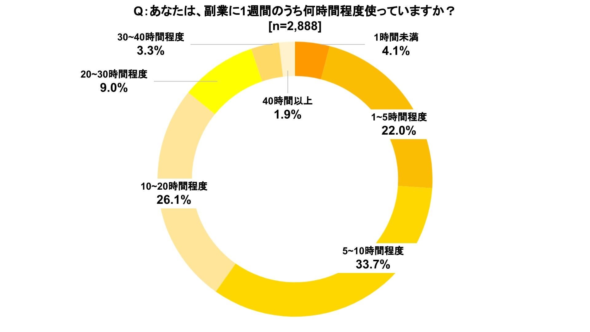 1ヶ月あたりの副業の収入の中央値は、20,000〜29,999円で、1週間のうち副業に充てている時間の中央値は、5〜10時間程度であった。また、副業をするタイミングとしては、「本業が休みの日(76.1%)」が最も多く、次いで「本業の勤務終了後(15.5%)」であった。