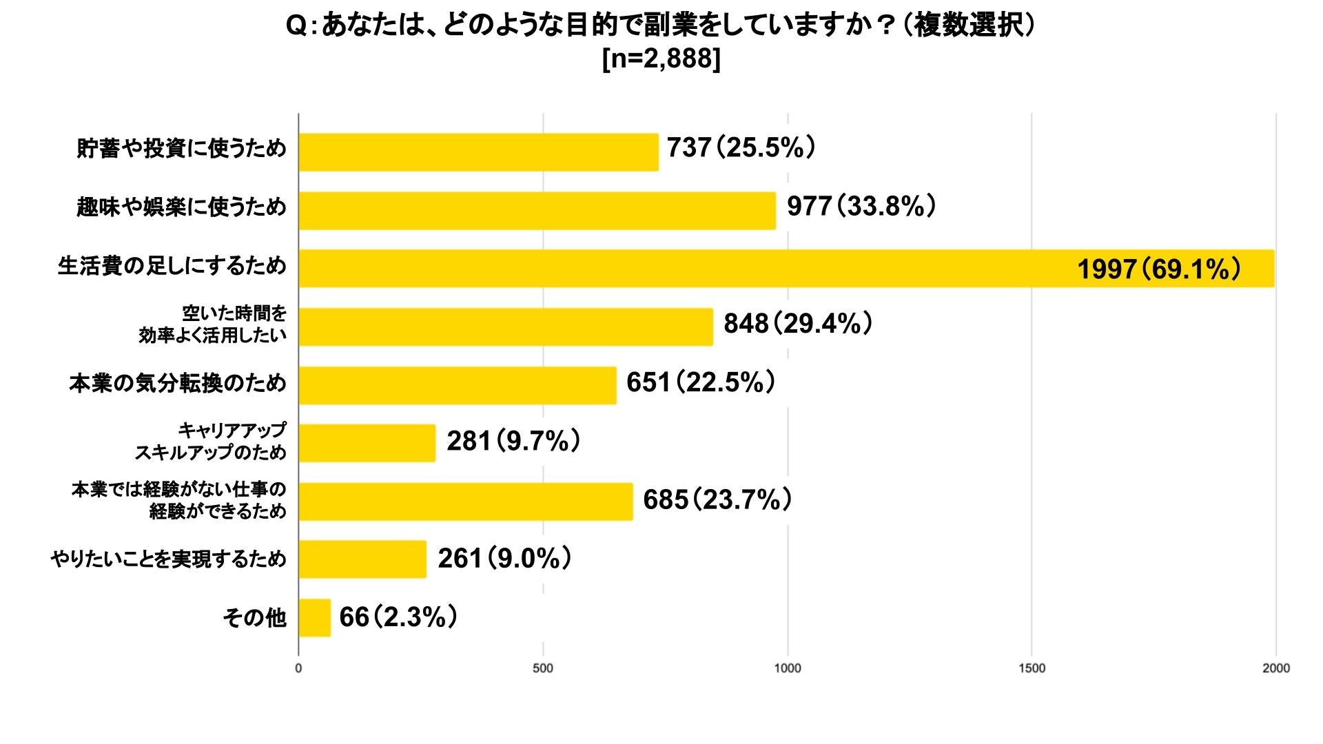 副業の目的を聞いたところ、「生活費の足しにするため(69.1%)」と回答した人が最も多く、そのほかにも「趣味や娯楽に使うため(33.8%)」「貯蓄や投資に使うため(25.5%)」といった、日常生活に直結する目的で副業をする人が多かった。一方で、「本業では経験がない仕事の経験ができるため(23.7%)」「キャリアアップ・スキルアップのため(9.7%)」「やりたいことを実現するため(9.0%)」など、自身の経験値を上げたり、目標を叶えるために副業をしている人も一定数いる事が判明した。