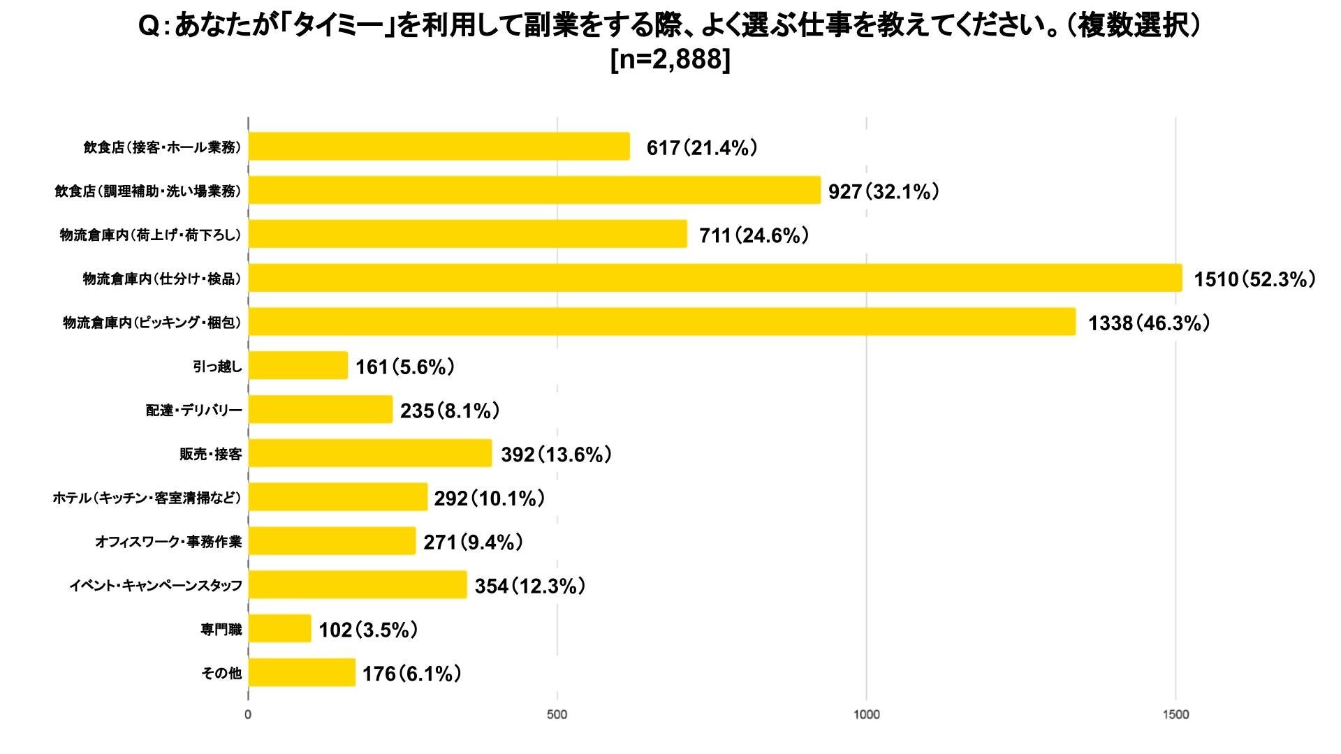タイミーを利用して副業をする際に、よく選ばれている仕事は「物流倉庫内(仕分け・検品)(52.3%)」、「物流倉庫内(ピッキング・梱包)(46.3%)」であった。