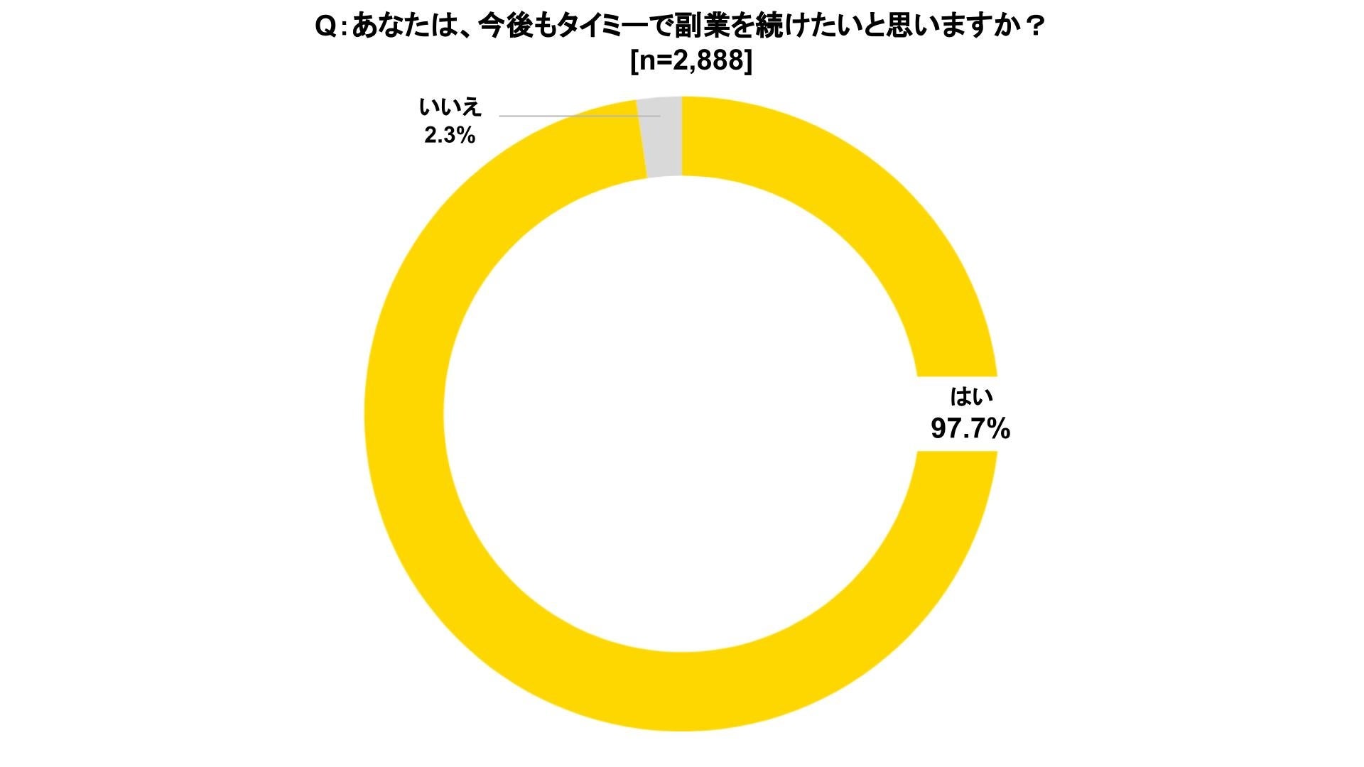 ・97.7%の人が「今後もタイミーで副業を続けたい」と回答。利便性だけでなく「さまざまな経験ができる」「視野が広がる」という理由で今後もタイミーで副業を続けたいと思っている方もいることがわかった。