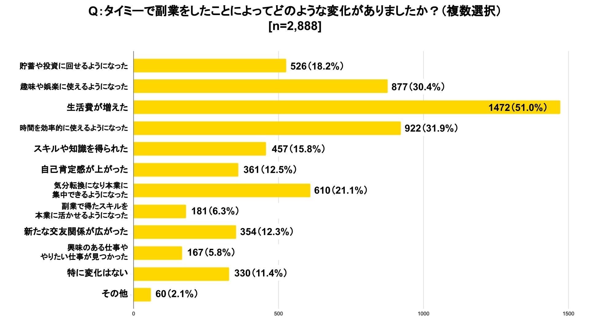 「タイミー」で副業をしたことによる変化について聞いたところ、「生活費が増えた(51.0%)」「趣味や娯楽に使えるようになった(30.4%)」といった収入面での回答が多かった一方で、「時間を効率的に使えるようになった(31.9%)」「気分転換になり本業に集中できるようになった(21.1%)」「スキルや知識を得られた(15.8%)」など、収入以外の面でも変化を感じている人がいることが判明した。
