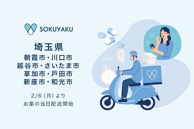 この度、埼玉県内8市(さいたま市・朝霞市・戸田市・和光市・新座市・川口市・草加市・越谷市)でのサービス開始により、対象エリア内の利用者は自宅やオフィスでオンライン診療・服薬指導後、当日中に薬局への来店不要で処方薬を受け取れるようになります。