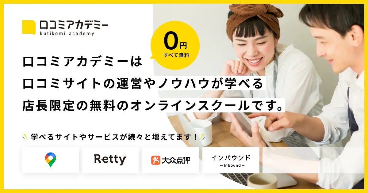 口コミアカデミーは、口コミサイトの運営やノウハウが学べる、店舗事業者限定の『無料』オンラインスクールです。