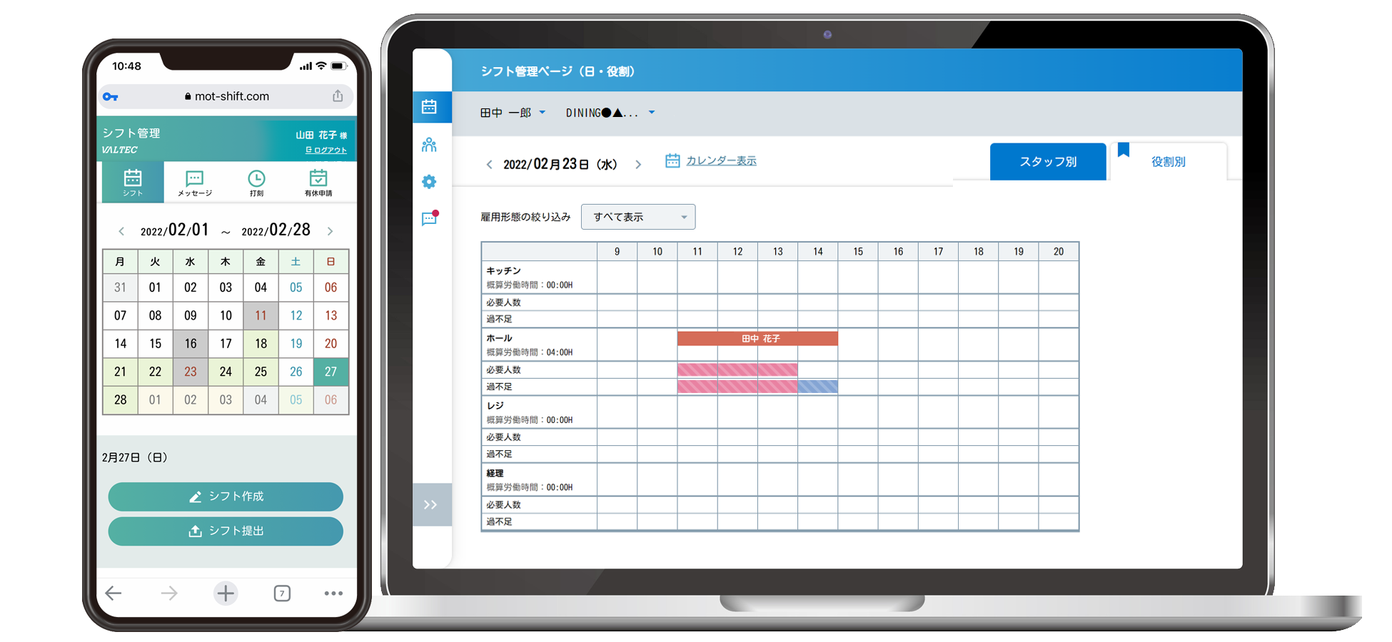 シフト管理システム「MOT/Shift」ならシフト提出依頼の自動送信やフロント・清掃など役割毎の過不足表示、法定労働時間・ 残業時間・勤務間インターバル・残有給数の表示などシフト管理を効率化する機能が豊富に揃っています。
