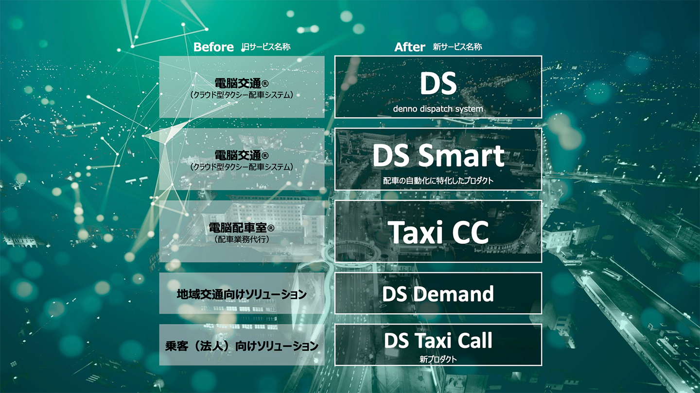 これまで提供していたクラウド型タクシー配車システム「電脳交通®」をはじめとする提供サービスの名称を以下のように変更・統一します。引き続きより良いタクシー事業者様向けサービス、自治体向け地域交通ソリューションを提供してまいります。