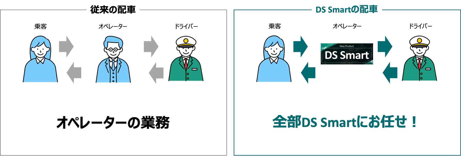 電話からの配車依頼も、スマホアプリからの配車依頼も、オペレーターの業務負担を飛躍的に削減し、DS Smartが円滑な自動化処理を実現します。