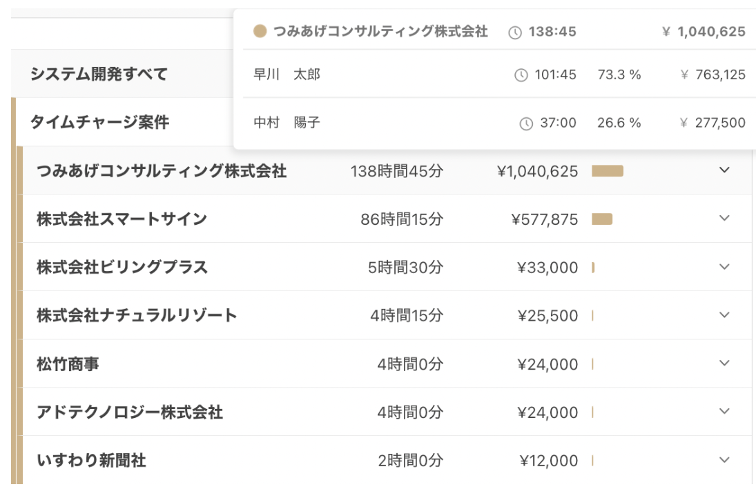▼プロジェクトごとの稼働時間・人件費が一覧で閲覧可能