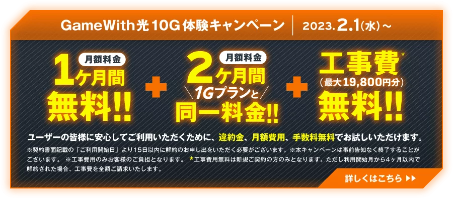 本キャンペーンは、当社所定の方法にて、「GameWith光10G」(以下「対象サービス」)へ新規お申込みいただいた場合に、お得な特典が受けられるキャンペーンです。開通工事費が無料(新規開通の場合)となるだけでなく、1ヶ月間の月額料金も無料、そして2ヶ月間の月額料金割引を適用いたします。