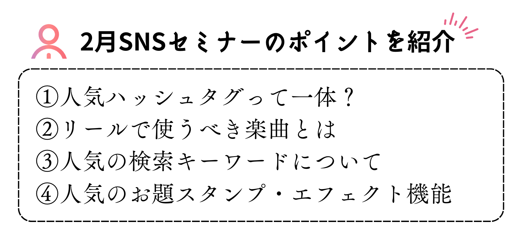 ①国内のInstagramの流行りをご紹介! ~若者から得る今後のトレンドは??~ ②企業におけるInstagram/SNS運用ノウハウ ③SNS全般について質問回答コーナー ・Instagram豆知識・トレンド |