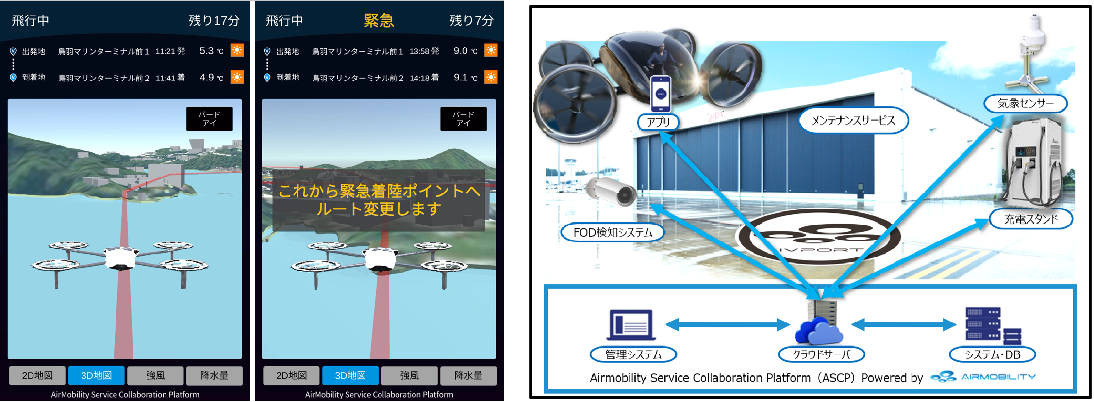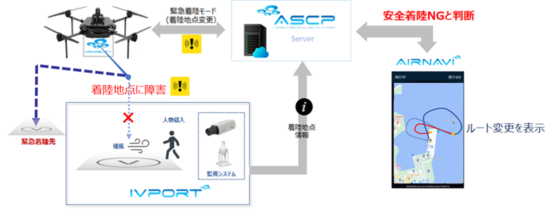 「AirNavi」とは、ルート設定などのナビゲーション機能をはじめ、リアルタイムの気象情報、離着陸場の情報など様々な条件を取り込み、空⾶ぶクルマの安全な運航を支援するものであり、今回の実験では同じくASCPの主要機能である離着陸場システム「IVport」を使って、正常着陸運航と緊急着陸運航の2つの機能確認を実施しました。