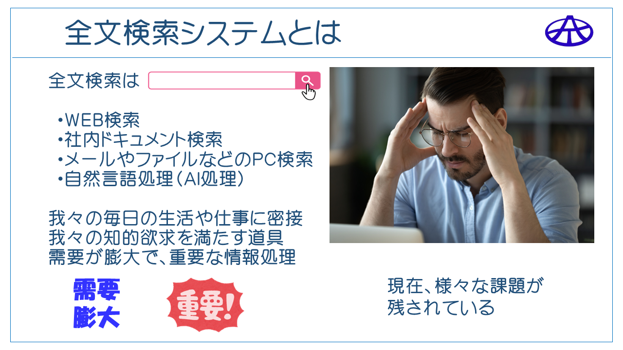 全文検索(キーワード検索)は、WEB検索はもとより、社内ドキュメント検索、PCのメール検索やファイルの検索、そして自然言語処理など、我々の生活や仕事に密接するばかりでなく、我々の知的欲求を満たすために無くてはならない情報処理(道具)です。