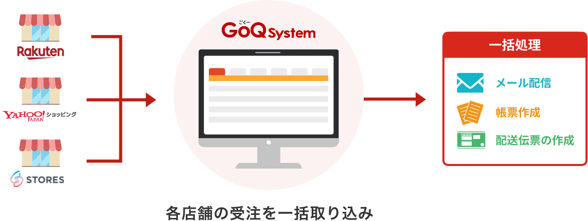 GoQSystemは通販業務を一元管理できるシステムです。全てのネットショップの受注・売上・在庫・商品データを1つのシステム内で管理できるため、業務効率を格段にUPすることができます。