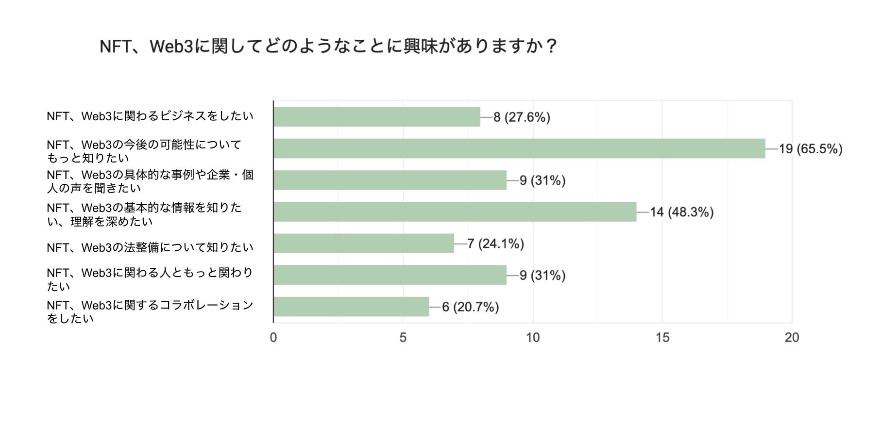 近年Web3、NFTに対する興味やビジネスの幅は、広がりを見せています。また、業種、規模に関わらず、Web3、NFTに関するビジネスチャンスの可能性も増大しています。ただし、多くの人が「どこから始めたらいいのかわからない」「具体的にどんなことができるのか不明である」「怖い・不安」という思いから、一歩踏み出せずにいます。MoMoとシマウマは昨年から、両社の拠点であるシェアオフィス、渋谷WeWorkにて、複数回Web3、NFTに関するイベントを実施してきました。参加者によるアンケート*においても、以下のような、「Web3、NFTの可能性や情報を知りたい、人や企業と関わりたい、もっとビジネスをしたい」という声が多数ありました。(*実施時期:2022年11月15日、対象:イベント参加者、回答数:29人)