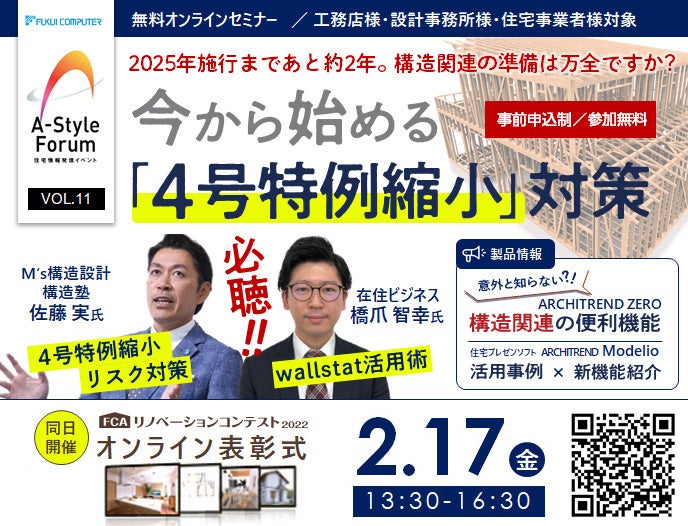 2023年2月17日(金)に住宅情報発信イベント「A‐Styleフォーラム VOL.11」を開催予定です。今回は【4号特例縮小】をメインに、ARCHITREND Modelio 2023の新機能もご紹介させていただきます。参加無料のオンライン開催ですのでお気軽にご参加下さい。
