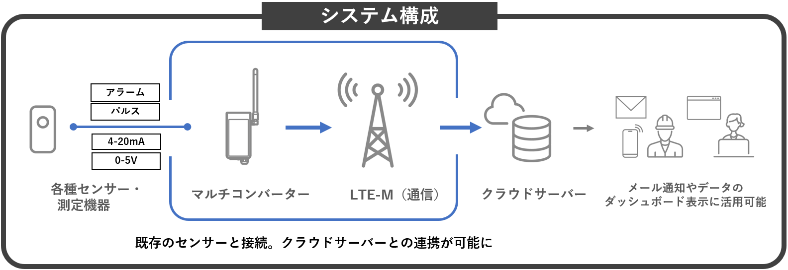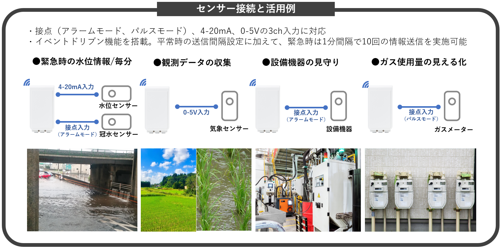 LTE-Mの採用でより広域の通信に対応するだけでなく、接点・4-20mA・0-5Vそれぞれの入力に対応。3チャンネルの同時接続を可能とするなど、現場の細かな要求に応えるスペックを備えました。