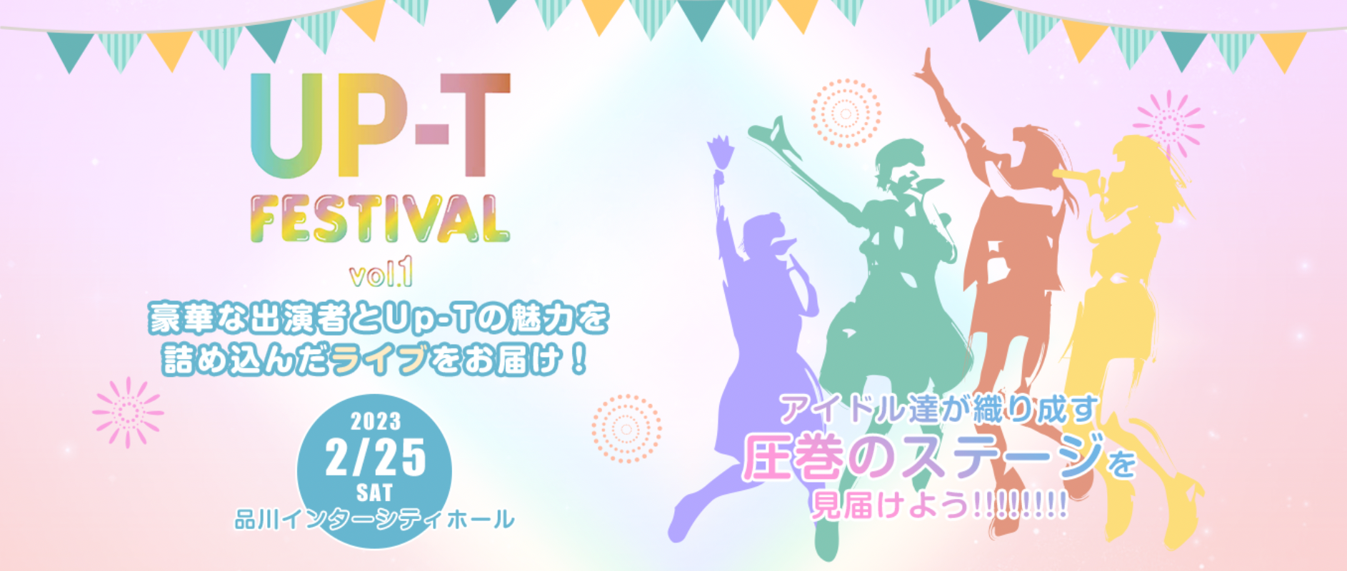 UP-T FESTIVAL vol.1は、オリジナルTシャツのUp-Tが主催する初のアイドルイベントとして、2月25日に開催を予定しております。今活躍するアイドル総勢19組が出演し、全てのアイドルがステージで最高のパフォーマンスを繰り広げます。さらにTGCなどのスポンサーを担うUp-Tならではのイベントであるランウェイなど今までのアイドルイベントにない新しいステージにもチャレンジし皆様にお楽しみ頂けるイベントを提供いたします。またこのランウェイから、お客様の応援で各コレクションへのノミネート、出演などにもなります。ファンの皆様のご参加をお待ちしております。