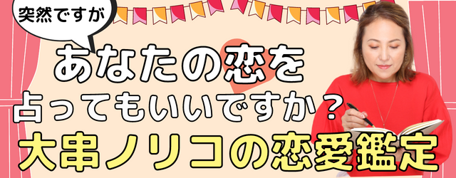 2月といえばバレンタイン、恋の季節です。好きな人に想いを伝えたり、新しい恋を探したりするのにピッタリな時期ですが…当サイトでは『突然ですが占ってもいいですか?』でおなじみの大串ノリコが占う、あなたの恋の悩みに最適な恋愛鑑定を集めました。あなたの恋愛が良い方向に進んでいくように心を込めて鑑定します。この機会にぜひ、大串ノリコの恋愛鑑定をご体験下さい。