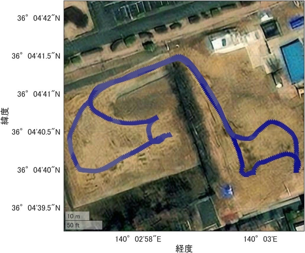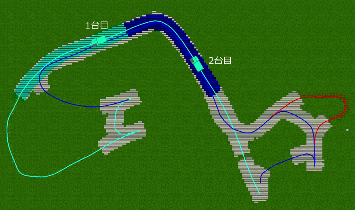 移動する建機の位置を遠隔操作室内のディスプレイによって確認しました(図―2)。加えて、「K5G-C-100A」で取得された受信信号とGPS情報を使い、屋外実験ヤード内を移動した時の受信電力特性を確認しました(図―3)。図―3の濃い青色ほど受信電力が高く、ヤード内では4Kカメラ映像を安定的に伝送できる電力値であることを確認しました。これらの位置情報と受信電力特性の情報を活用することで、屋外実験ヤード内の建機2台が往路と復路のルートに対して安全間隔を保ちながら自動走行が可能となりました。