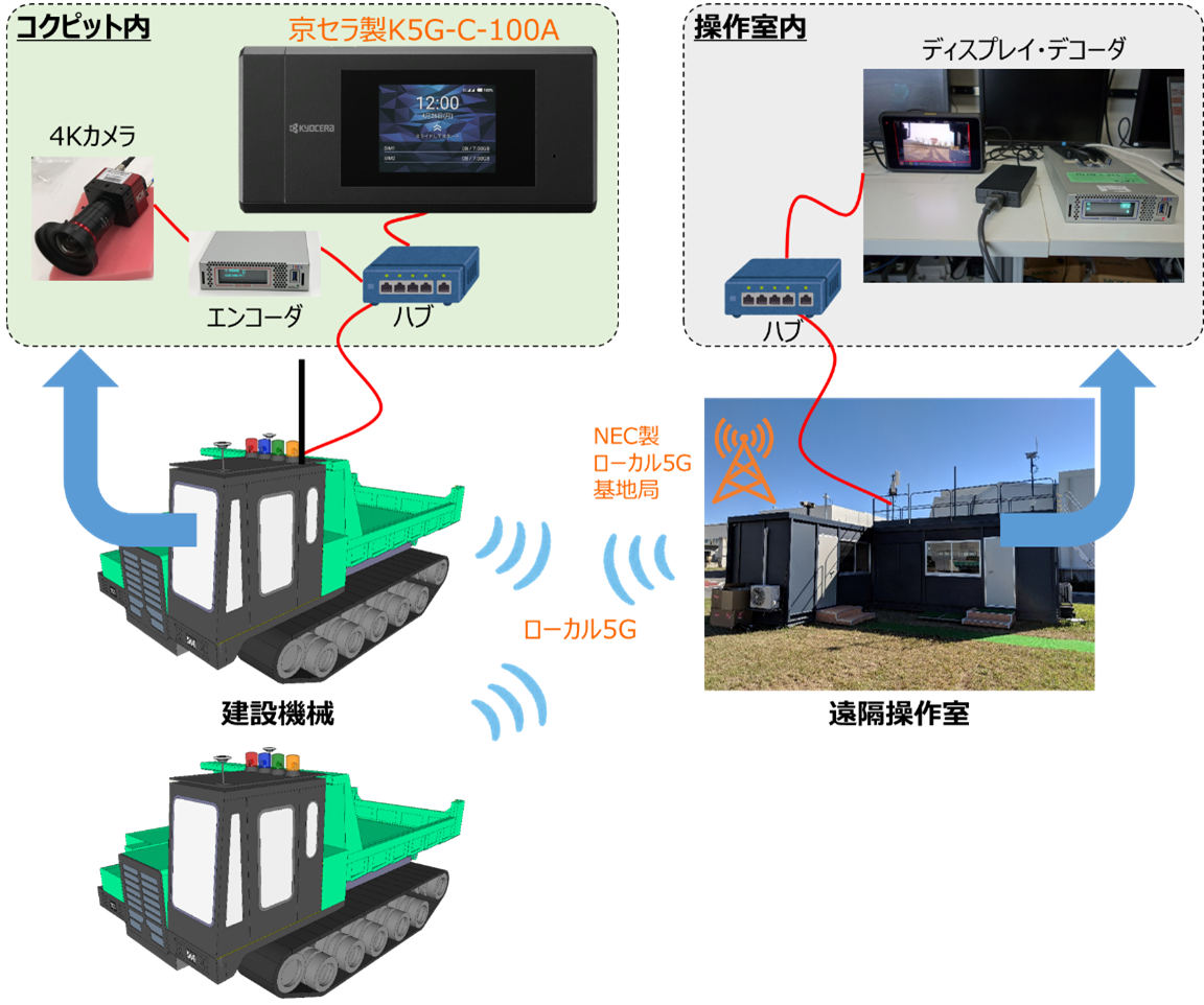 技術研究所内の建物にNEC製ローカル5G基地局を設置し、アンテナを屋外実験ヤードに向けました。遠隔操作並びに自動走行が可能な建機上には受信電力情報をリアルタイムで取得できる京セラ製ローカル5G対応デバイス「K5G-C-100A」を設置しており(写真―1)、車載4Kカメラの映像をIP(インターネットプロトコル)ネットワークの上り回線を通じて高速なパケット伝送を行い、遠隔操作室内に設置されたディスプレイにデコーダ出力を80msecで表示することが可能となります(写真―2、写真―3)。また、基本構成図は以下となります(図―1)。