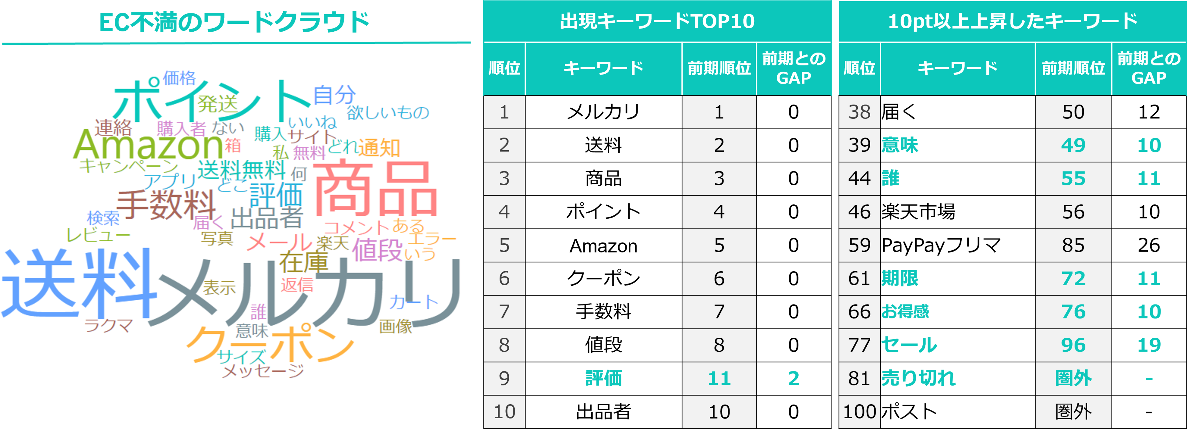 出現キーワードランキングで新たにTOP10入りしたものは「評価」となった。10pt以上順位を上げたキーワードは、一般的にECのクチコミ・レビューに頻出する梱包・配送関連のワードを除くと「意味」「誰」「期限」「お得感」「セール」「売り切れ」となった。
