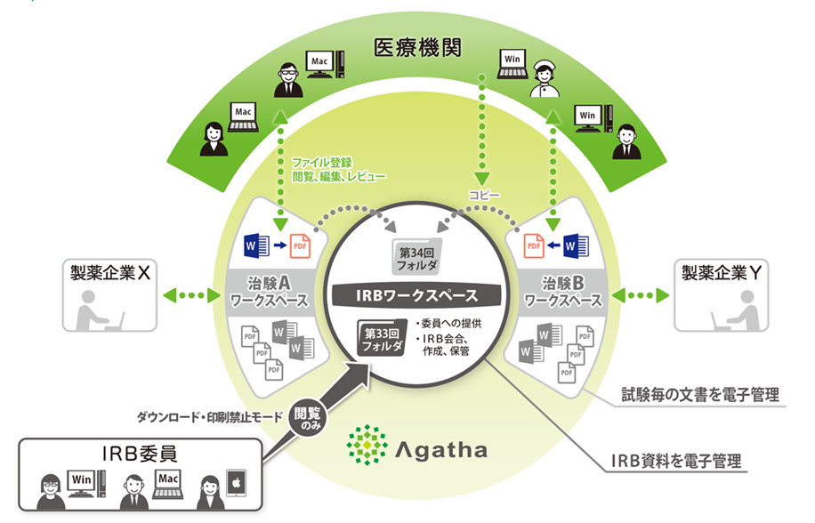 「Agatha IRB(IRBワークスペース)」では、IRB資料の管理・保管を行います。IRB委員への審査資料の事前配布、IRBのオンライン開催にも利用できます。