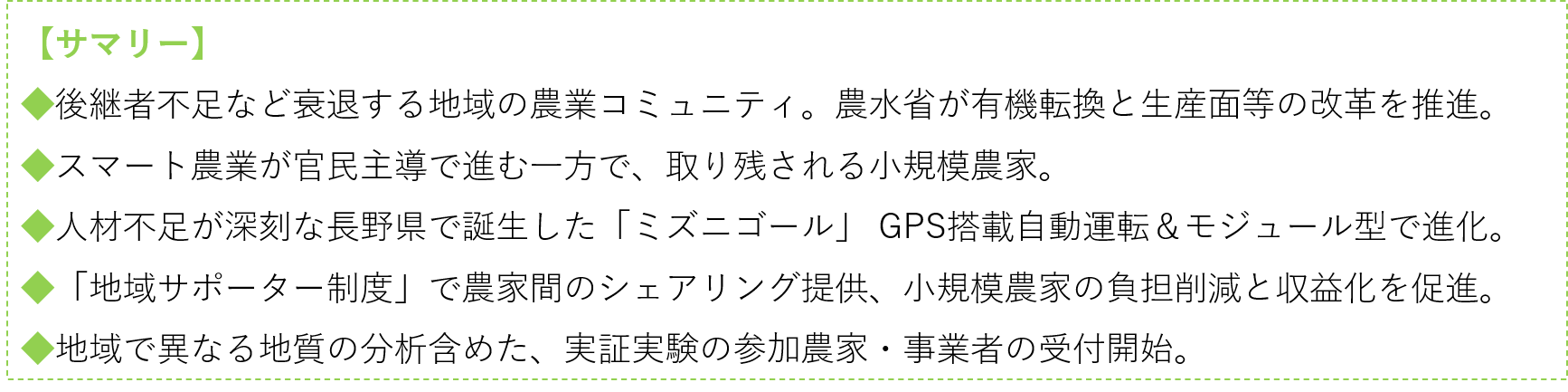 農家数が10万戸以上*と全国で最も多い長野県。小規模零細農家が多く全国平均よりも高齢化が進んでおり、後継者問題や耕作放棄地も増えています。また山間部が多い地形的理由からも、大規模集約化によるコスト削減が難しいといった課題があります。除草ロボットは大手企業でも開発が進んでいるものの、数十万円~百万円以上するなど、小規模農家が季節利用に限られる設備投資として導入するにはハードルが高い状況です。前回のミズニゴール1.0の実証実験ではレンタル提供を実施。ミズニゴールの開発事業は、長野県のソーシャルビジネス創業支援事業に採択されました。第11回信州ベンチャーサミットにてオーディエンス賞受賞。(参考)農林水産省「農林業センサス(H27)」